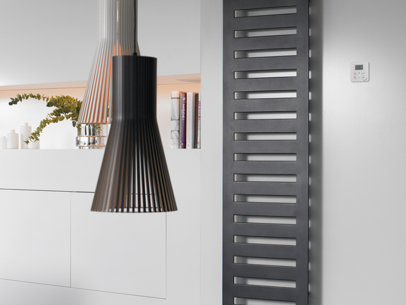 Het subtiele ontwerp wordt extra kracht bijgegeven door de muurbevestiging van de radiator. Deze bevestigingen in de kleur van de radiator bevinden zich namelijk aan het kader waardoor deze niet zichtbaar zijn als je voor de radiator staat. Hierdoor en door de verfijnde vormgeving lijkt het alsof de radiator ‘aan’ de muur zweeft, een optische illusie.