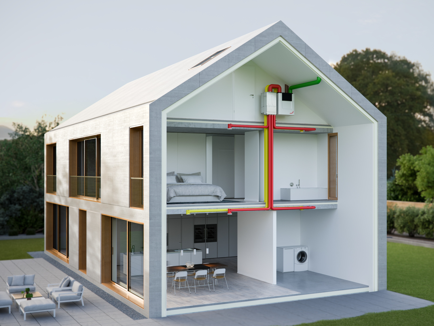 Ook koelen met het ventilatiesysteem? Kies dan voor het Zehnder luchtverdeelsysteem met geïsoleerde kanalen. Deze kanalen zijn voorgeïoleerd volgens de innovatieve ThermalShield-lijn. Zo wordt de verse lucht perfect op temperatuur naar de kamers gebracht, zonder onderweg energie te verliezen. Dé oplossing voor condensatie of vervelende lekkages.